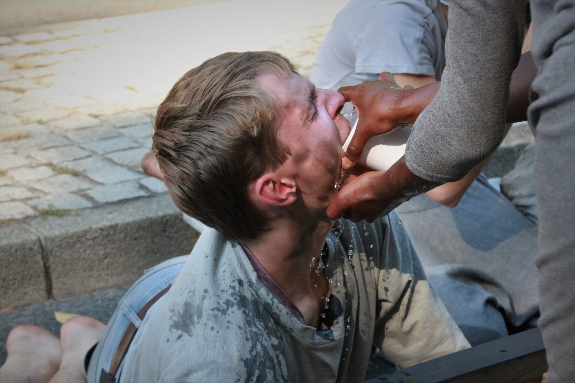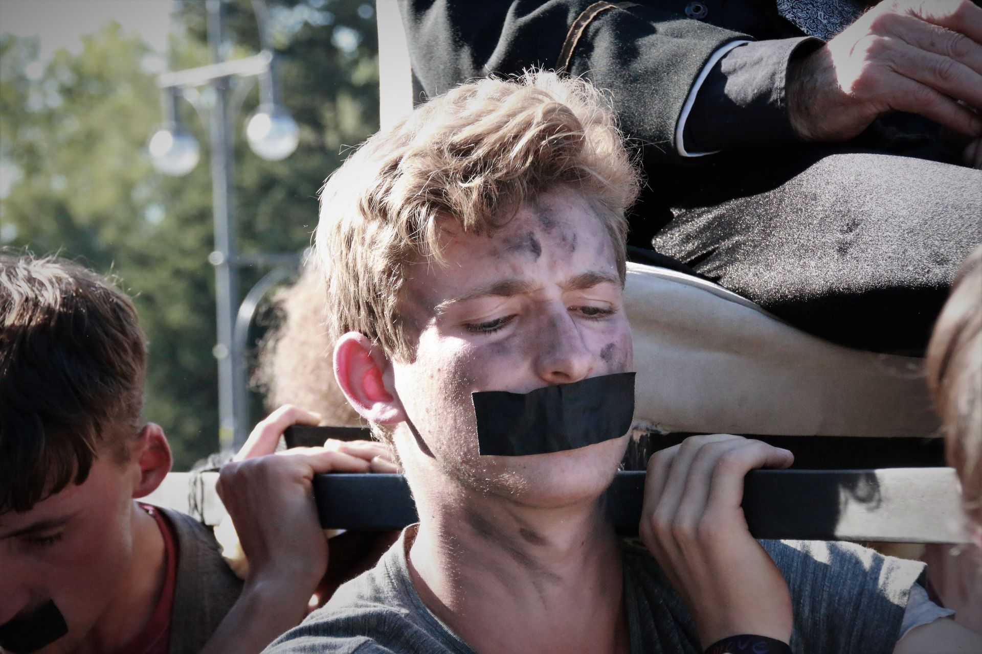 Wir entfernen das Klebeband von unsern Mündern.